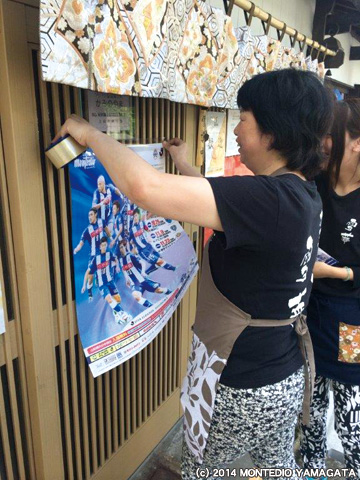 続いては、上山市内の商店街でおこなったポスター配布活動の様子についてレポートいたします。活動は“上山市 市民応援デー”を前に、上山モンテディオサポーターズクラブさんのみなさんと一緒にポスター配布活動を行いました。