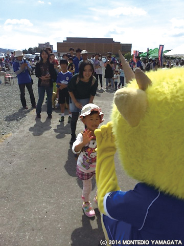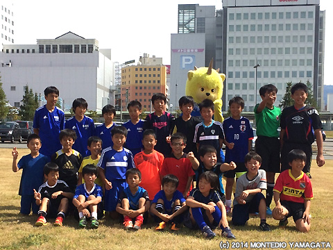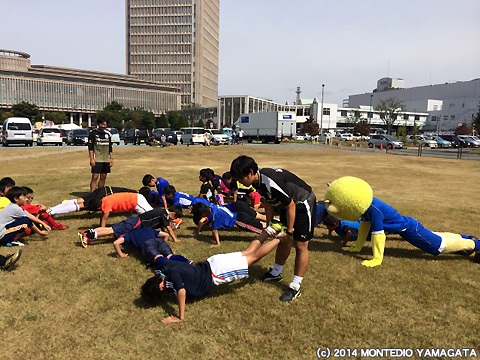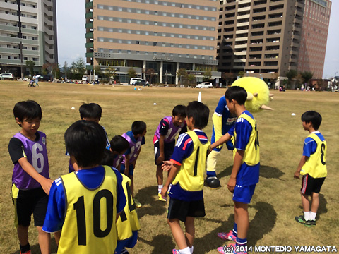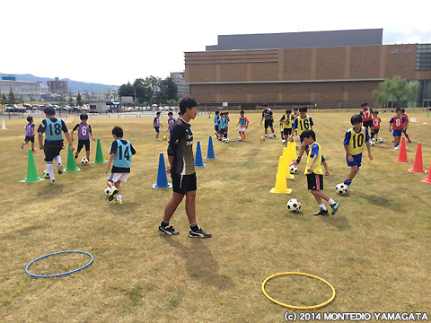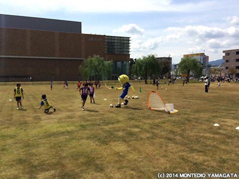 まず、10時半から、モンテディオ山形サッカースクールを実施。この芝生広場は結構きれいで、子供たちも楽しみながら、指導を受けられたようです。