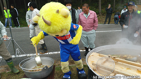 植樹で汗を流した後はみんなで芋煮会。ディーオも盛り付けのお手伝い。