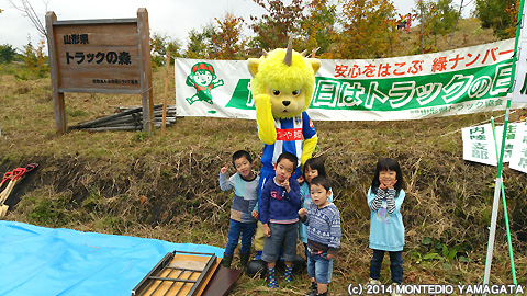 トラックの森とは、山形県トラック協会が毎年植樹している森のことで、そこにはたくさんの若くて可愛いらしい樹木が植わっておりました。場所は山辺町にある県民の森から少し上ったところにあります。