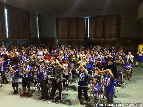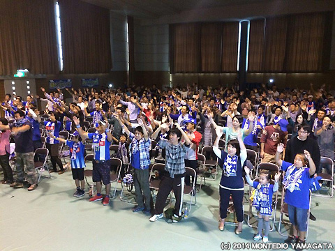 10月4日(土)天童市の総合福祉センターでモンテディオ山形vs.FC岐阜のパブリックビューイングが行われました。会場には約250名の大勢のサポーターの皆様に足を運んでいただき、席はほぼ満席状態となりました。