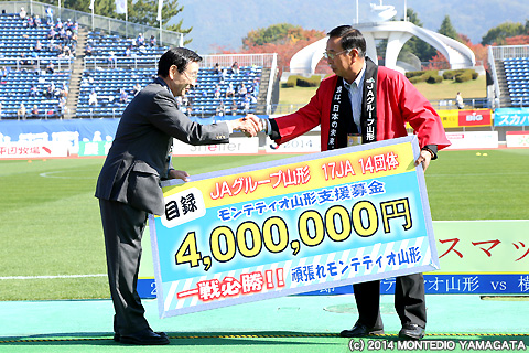 さらにJAグループ山形様からは支援募金の贈呈を頂きました。ユニフォームのスポンサーも含め様々な場面で力強いご支援を頂いています。長年のご支援有り難うございます。