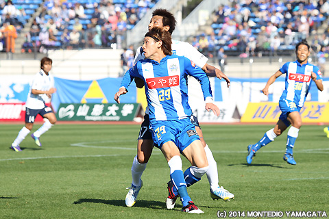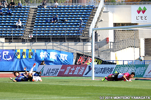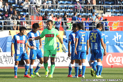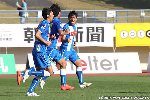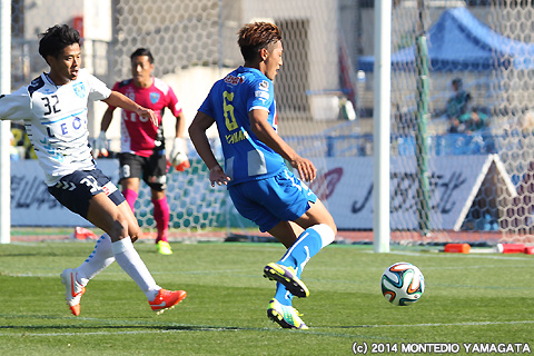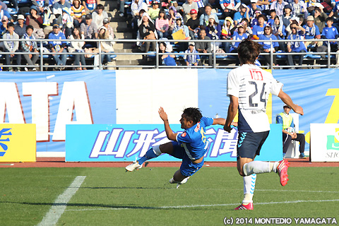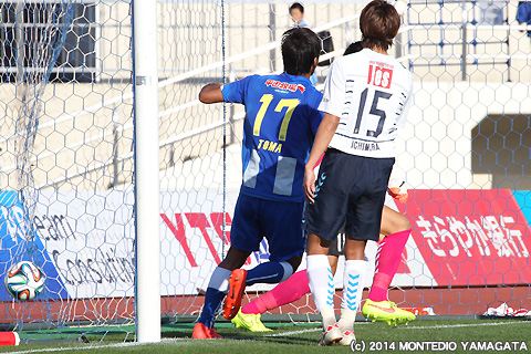 しかしJ1昇格のために何としても勝ち点を積み上げたいモンテディオ山形は、80分、フリーキックからの舩津徹也選手のヘディングシュートを相手ゴールキーパーが前に弾いたところを當間建文選手が押し込み1点差とします。
