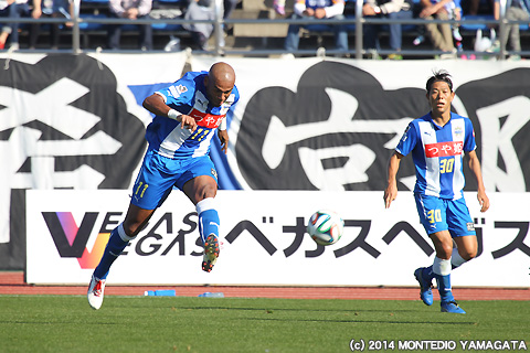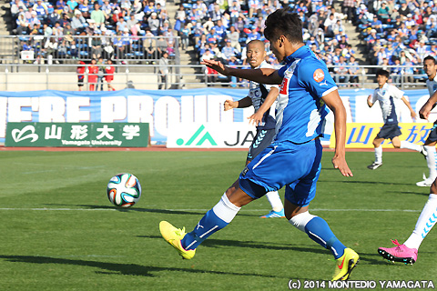 攻撃の手を緩めないモンテディオ山形は、中島裕希選手のほか伊東俊選手やロメロフランク選手も投入。ロメロフランク選手も左サイドに流れると鋭くクロスを入れます。