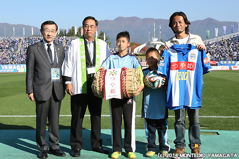 前半を1-1で折り返すと、ハーフタイムにはJリーグ通算入場者数200万人達成の記念品贈呈が行われます。クラブからは200番のナンバーが入った特製公式ユニフォームと選手サイン入り公式試合球、そしてJA全農山形様からも、つや姫200kgが贈呈されます。