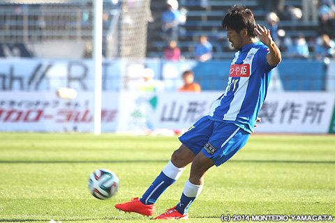 右ライン際のフリーキックを蹴る當間建文選手。モンテディオ山形は一人少ない中、61分と75分に失点し、2点のリードを許してしまいます。
