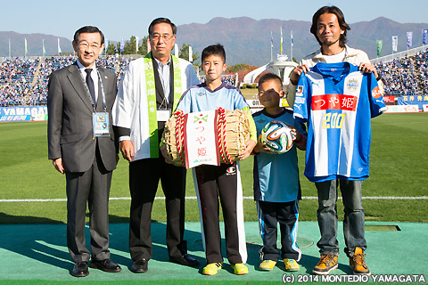 長沢 天君には200万人達成の記念品として「No.200」入り公式ユニフォーム。選手サイン入り公式試合球、表彰式記念パネル、2014サンクスパーティ参加権、つや姫200キロが贈呈されました。