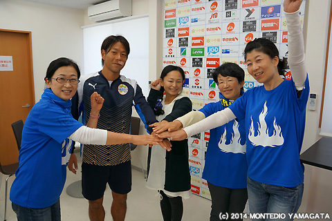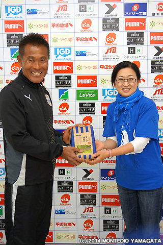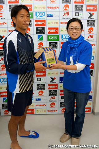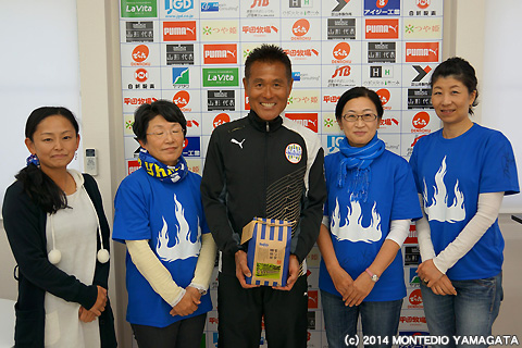 さて、去る10月25日、稲村和子代表をはじめとするグループ農夫の会のみなさまがクラブハウスに見えられ、山辺町大蕨棚田で今年収穫されたばかりの棚田を石﨑信弘監督、山﨑雅人選手に贈呈頂きました。