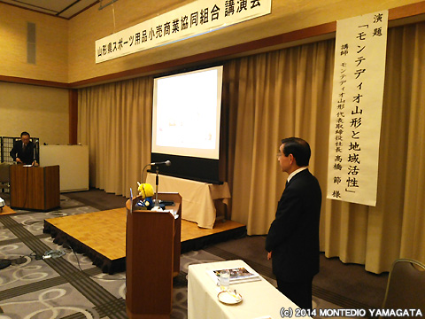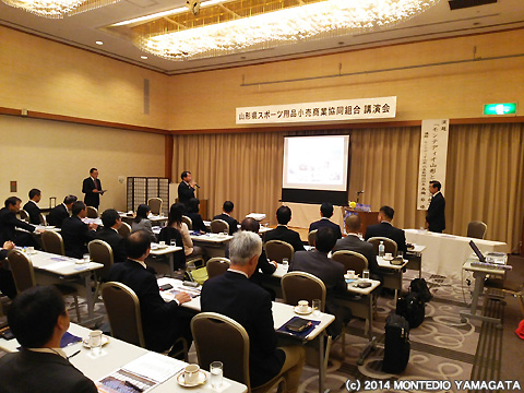 11月5日に山形県スポーツ用品小売商業協同組合様が主催する講演会に、講師として弊社社長の髙橋節をお招きいただき講演してきました。講演会のテーマは「モンテディオ山形と地域活性化」でした。みなさま真剣にご聴講くださいました。
