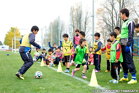 こちらは普段チームが練習場として使用している第3運動広場で行われた、東日本大震災復興支援サッカー教室の模様です。これはモンテディオ山形選手会が主催しているもので、宮城県名取市閖上の子供たちを山形にご招待しサッカー教室やホームゲーム観戦の招待を行っています。