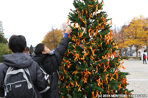 中央門入り口のところに設けられた「オレンジリボンツリー」。オレンジリボンキャンペーンは