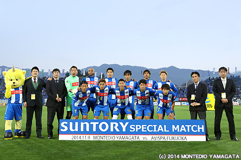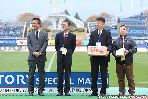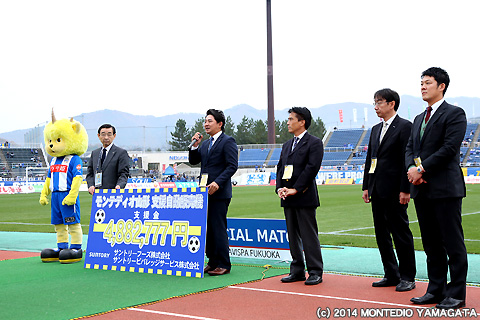 この試合はクラブのスポンサーであるサントリーフーズ株式会社様の「SUNTORY SPECIAL MATCH」として開催。特設ブースではモンテディオ山形応援ベンダーの設置受付やサントリー飲料1400本のプレゼント等も行って頂き、また応援ベンダーからの支援金の贈呈も頂きました。