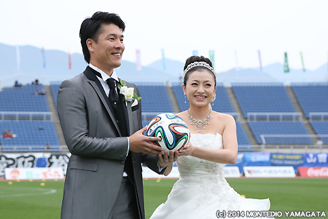 試合前のピッチサイドでは、山形市在住の佐藤遼さん、綾子さんご夫妻のスタジアムウェディングが執り行われます。これはクラブスポンサーのパレスグランデール様が企画した【DREAM WEDDING PROJECT】として行われたものです。