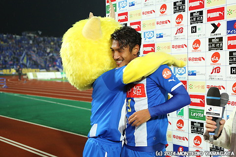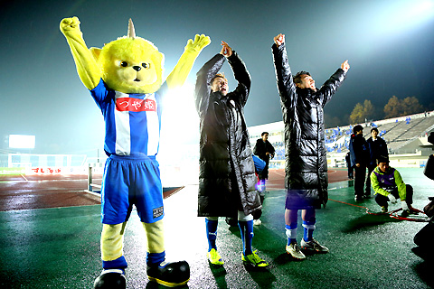 そしてディーオと一緒にサポーターに答える山田拓巳選手と中島裕希選手。こちらも大きな声援が掛かります。さあ、J1に向かって戦い続けましょう!