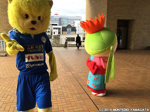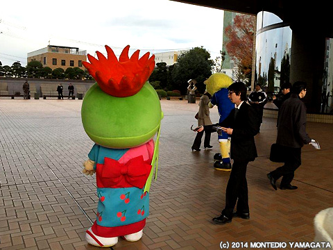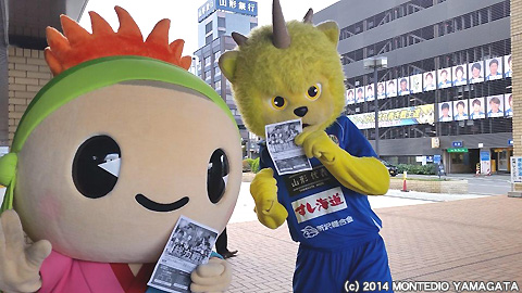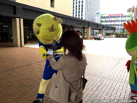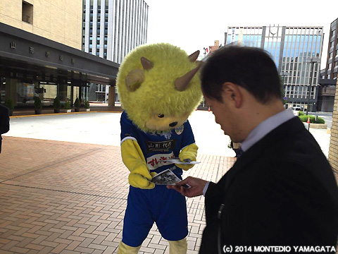 11月19日(水)早朝から山形市役所前でスタッフとマスコット ディーオ、助っ人として「はながたベニちゃん」にも手伝っていただき、みんなでチラシ配布を行いました。