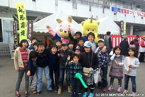 朝日町のマスコット「桃色ウサヒ」とは、毎年いろんな場所で会って、お互いの活動に協力していたりします。この日も一緒に活動。