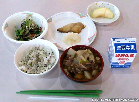 授業が終わった後はみんなで給食を食べます。この日の献立は菊ごはん・牛乳・芋煮汁・焼き魚(ほっけ)・小松菜の磯辺和え・りんご でした。みんなとても美味しそうに食べていましたよ!普段は野菜が嫌いで残してしまう子も、完食しており、さっそく授業の効果を実感しました。