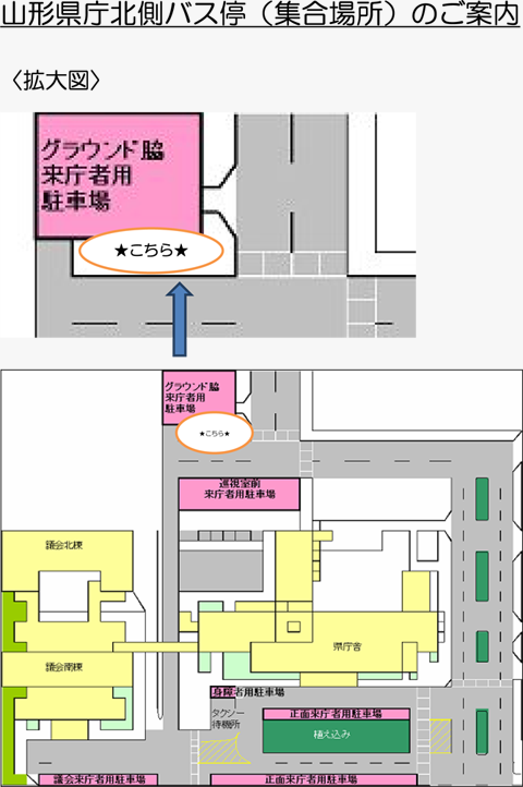 (第四乗降地)山形県庁北側バス停※案内図リンク(集合7:30/出発7:50)→