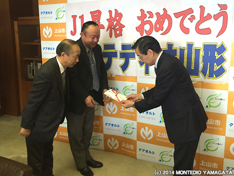 昨日(12月9日)に上山市モンテディオ山形を応援する会様より、モンテディオ山形リボンマグネット応援募金50万円をいただきました。