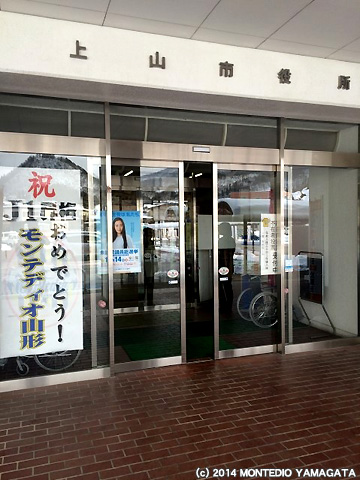 PS.上山市役所の正面玄関にはすでに昇格祝いの幕が張ってありました。
