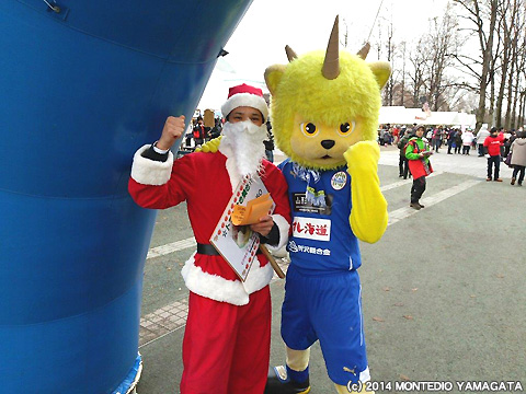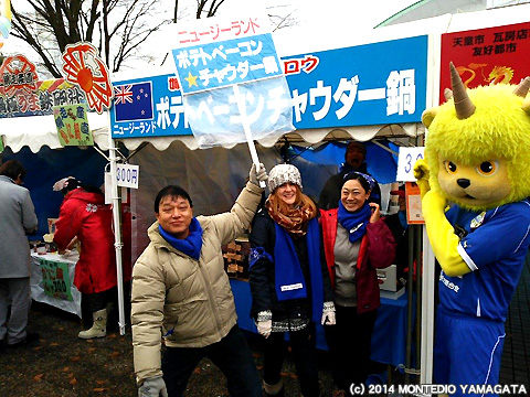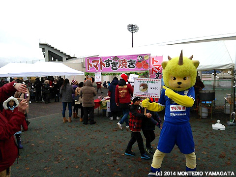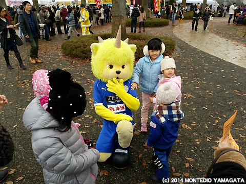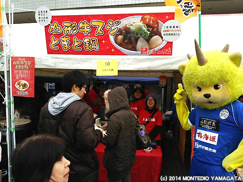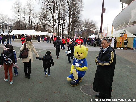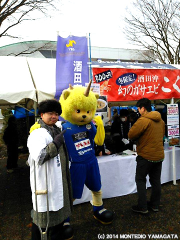 寒い日はやっぱり鍋!ということで、試合前日でしたが、ディーオはこの日も県内のイベントへ参加します。今回参加したのはNDソフトスタジアム山形前でおこなわれた、「第20回天童冬の陣 平成鍋合戦」です。平成鍋合戦は、平成8年から毎年開催されており、天童の冬の一大イベントで、山形県内のおなじみの鍋はもちろんのこと、東北地方や日本を飛び越え、海外の鍋料理を一度に味わうことができます。