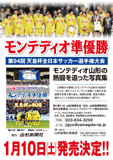 山形新聞社様発行、モンテディオ山形の天皇杯の軌跡を追いかけた写真集「モンテディオ準優勝」が1月10日に発売となります。スポーツプラザ21でも販売いたします。昨年の快進撃の軌跡を振り返る一冊。ぜひお買い求めのほどお願いします。