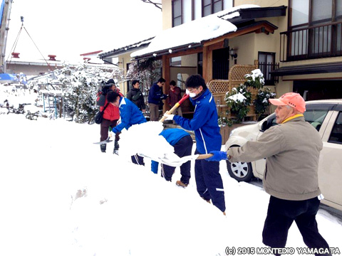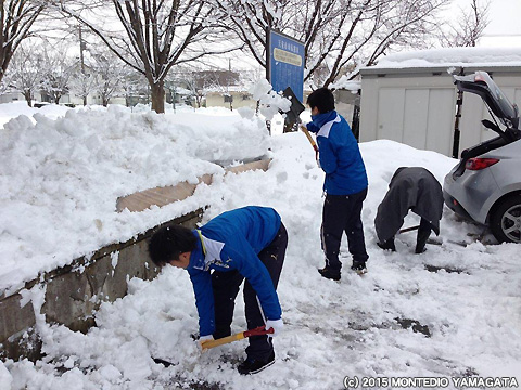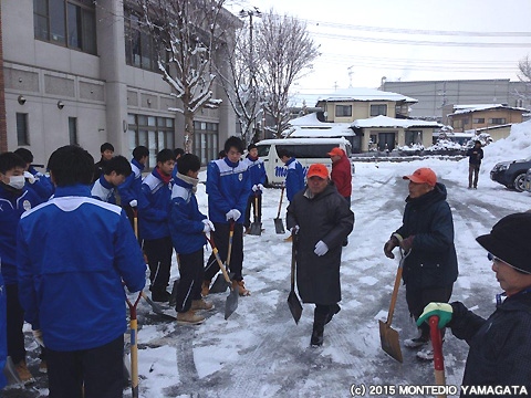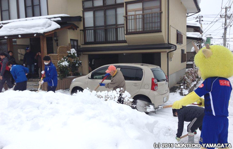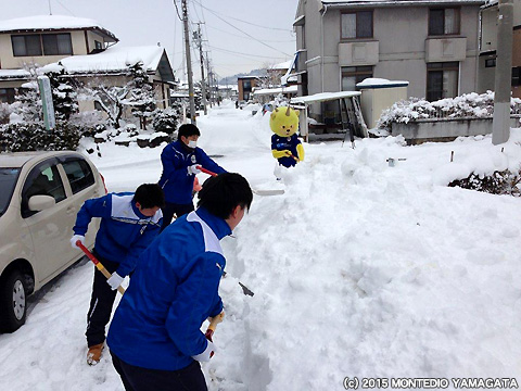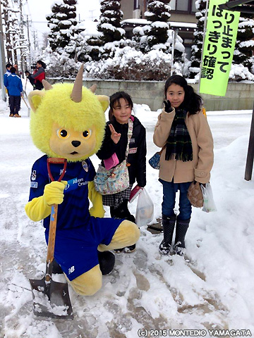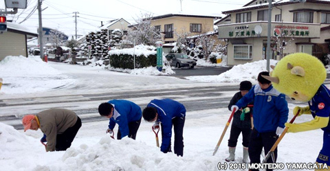 モンテディオ山形ユース選手とディーオが天童長岡地区の雪かきをおこないました