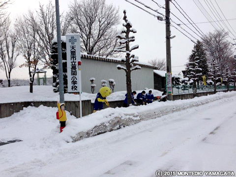 続いて、長岡地区にある長岡小学校の前をみんなが安全に登校できるように願いを込めて、雪かきをおこないました。