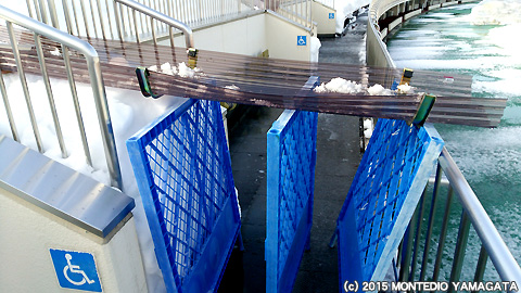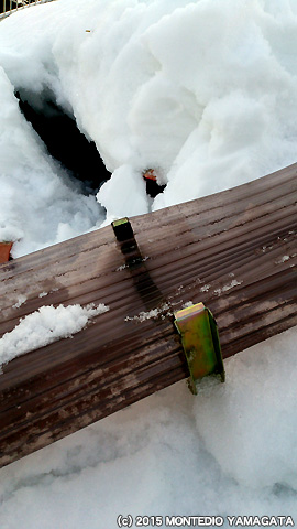 こんな風に縦の通路に波板のすべり台を作り、雪をスタンドの下に滑らせて流し落とします。