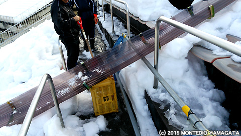 お集まりの皆様を30人くらいのチームに分けさせていただきます。雪を運んで流す方、下で詰まった雪を落とす方に振り分けます。当日はモンテスタッフのリーダー「雪かき隊長」が音頭を取ります。