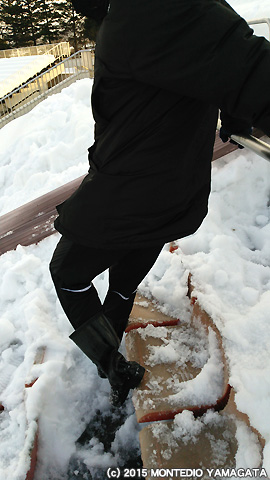 座席の上と足元を除雪していただくのですが、座席に積もった雪はとても滑りますので、足元を歩いて除雪してください。本当に危険です。