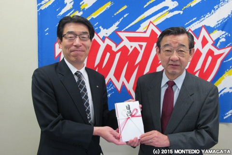 この日、弊社モンテディオ山形社長室で贈呈式が行われ、山形銀行県庁支店の木村昭広支店長から弊社髙橋節社長が募金を受け取りました。山形銀行県庁支店に勤務する行員の皆様からの募金です。