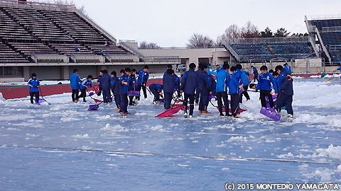 アウェイ戦浦和戦当日3月14日の午前、NDソフトスタジアム山形では除雪作業が行われました。