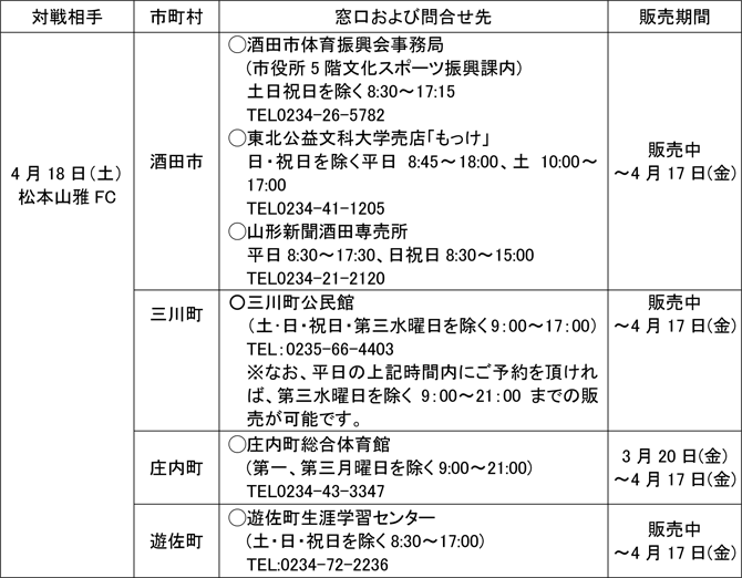 | 4月18日 | 土 | 14:00 | 松本山雅FC | 酒田市・三川町・庄内町・遊佐町 |