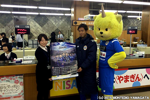 フラッグ掲出活動とほぼ同時刻に、同じく山形市中心商店街でNo.7松岡亮輔選手、No.13石川竜也選手がポスター掲出活動へ参加いたしました。両選手とも日頃よりクラブをご支援いただいている、地域のみなさまと交流を図りながら、積極的にポスター配布をおこないました。