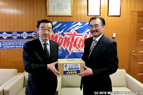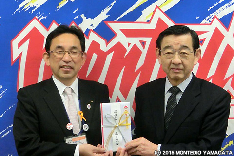 尾花沢市を代表して、尾花沢市教育課長の五十嵐様と同社会教育係長の倉林様より、80,000円のモンテディオ山形の応援募金をいただきました。