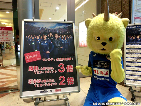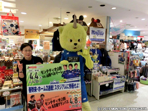 メモリアルプレート設置式に参加後、ディーオが向かった先はエスパル山形店様です。エスパル山形店様ではモンテディオ山形を応援する様々な取り組みをおこなっていただいており、チームが勝利した翌々日はカードのポイントがなんと3倍!引き分けの場合でも2倍になるといったサービスや試合当日には観戦チケットの半券を提示することで様々なお得なサービスを受けることができます。