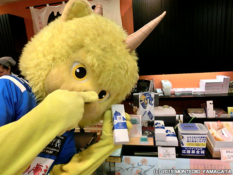 こちらはのし梅本舗佐藤屋様のモンテディオ山形応援お菓子「頂」を宣伝。ディーオも食べたそうにしていました。