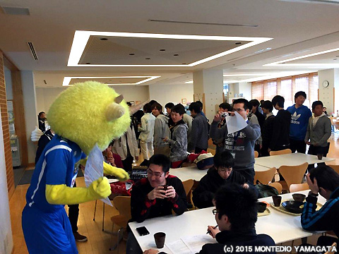 続いて、カフェテリアへ。お昼ということもあり、たくさんの学生が。みんな~スタジアムへ遊びに来てね!とディーオは必死にPRしていました。
