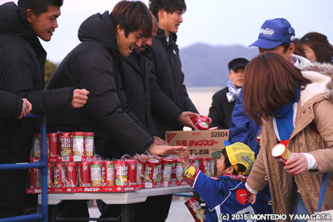 この試合でもNDスタにお越し頂いた皆さんを選手たちがお出迎えをしました。ヤマザキナビスコカップということで、ナビスコのお菓子を配りながらサポーターのみなさまと交流しました。