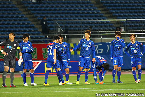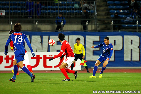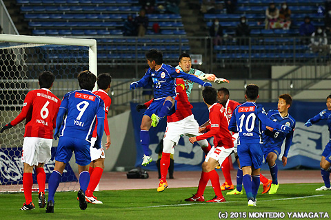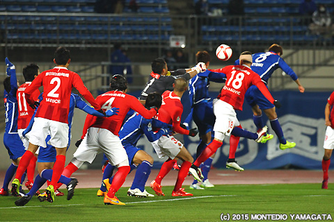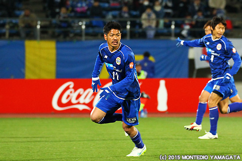 さて先行を許したモンテディオ山形ですが、40分、石川竜也選手の蹴った右コーナーキックを當間建文選手が頭から飛び込みゴール!同点に追いつきます。
