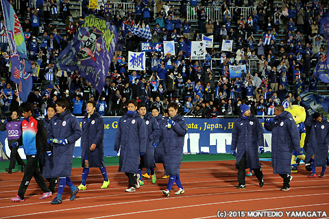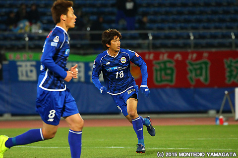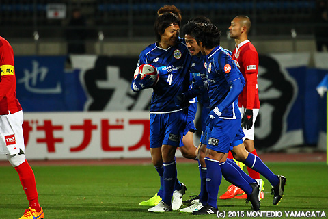 一度は同点に追いついたモンテディオ山形ですが、再びゴールを許してしまいリードを奪われます。しかしそこでまたしても當間建文選手がやってくれます。本人曰く、プロ選手となって初の一試合二得点となるゴールを宮阪政樹選手のフリーキックから決め同点に追いつきます。