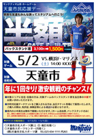 5月2日(土)横浜F・マリノス戦は天童市応援デーです。天童市に在住・在勤の方はチケットを半額でご購入頂けます。(バックスタンド一般席当日価格3,100円のところ→1,500円で販売)お得なこの機会にぜひスタジアムへ応援に来てください。