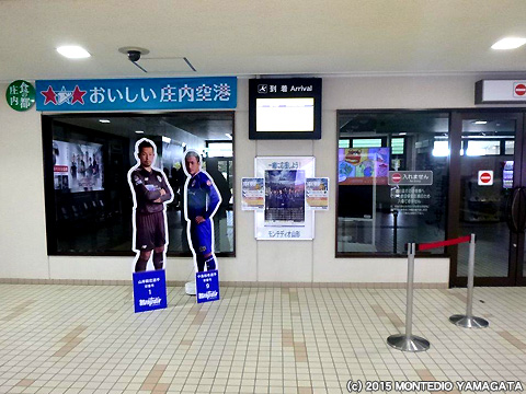続いてご紹介させて頂くのは、いつも熱いサポートを頂いている庄内空港ビル様です。今回、みなさまにご紹介させて頂くのは庄内空港の到着ロビーへモンテディオ山形選手の等身大パネルと庄内町応援デーの告知POPを期間限定で設置させて頂きました。