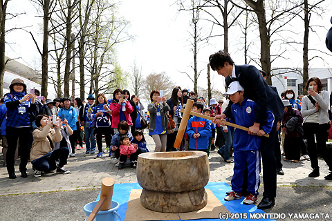 JA全農山形様にご協賛頂いた選手によるお出迎えときな粉餅の振る舞いなどが行われ、子どもたちが選手と一緒に餅つきもします。