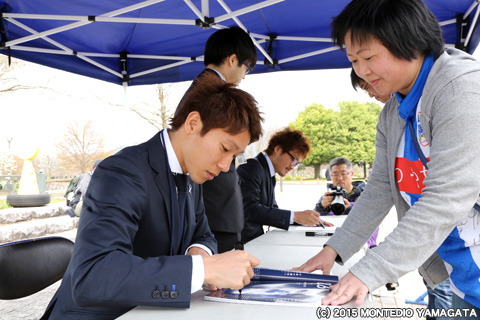 選手サイン会には、今季移籍加入した宇佐美宏和選手と渡辺広大選手が登場。ともに怪我のためモンテディオ山形の選手としてNDスタにはまだ登場していませんが、一足早くサイン会に登場です。