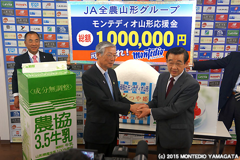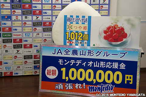 J1残留に向けて戦い続けるモンテディオ山形に対し、力の源ととして、1012個の「おにぎり」、農協牛乳396パック、旬の果物、マグネットリボン募金や昨年末より販売いただいた「勝利の感動米」の売上から100万円を応援金として頂戴いたしました。