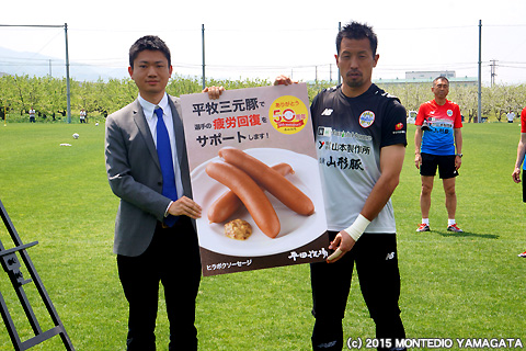 先日5月1日金曜日モンテディオ山形トップチームの練習場にて平田牧場様より「ヒラボクソーセージ」を贈呈頂きました。
