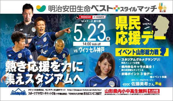 5月23日(土)ヴィッセル神戸戦は「県民応援デー」で、たのしいイベントがいっぱいです。ぜひ一人でも多くの方にスタジアムへ駆けつけて頂き、選手を後押しして頂ければと思います。