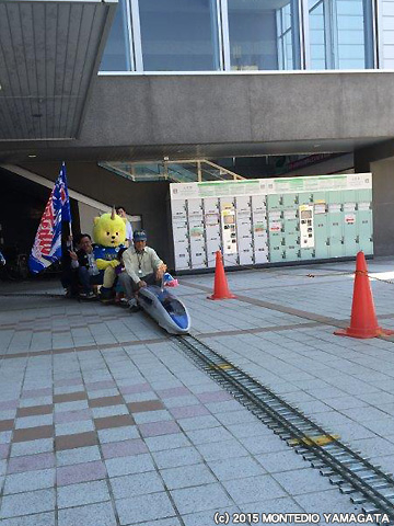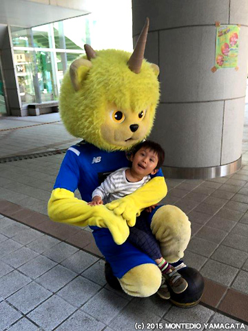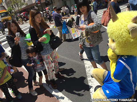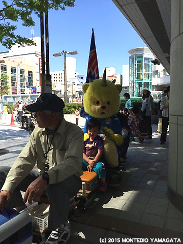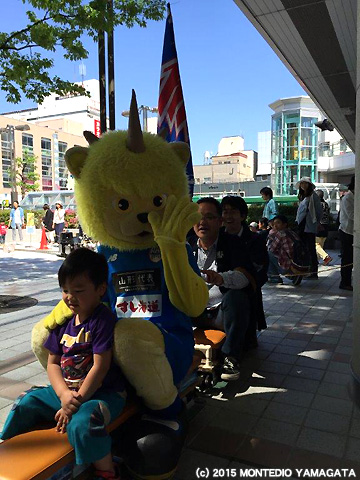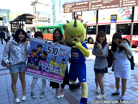 続いてディーオは山形駅前にミニSLが登場していると聞き、山形駅前へ移動!駅前へ移動すると、さっそく試合のPR!みんなスタジアムへ遊びにきてね。